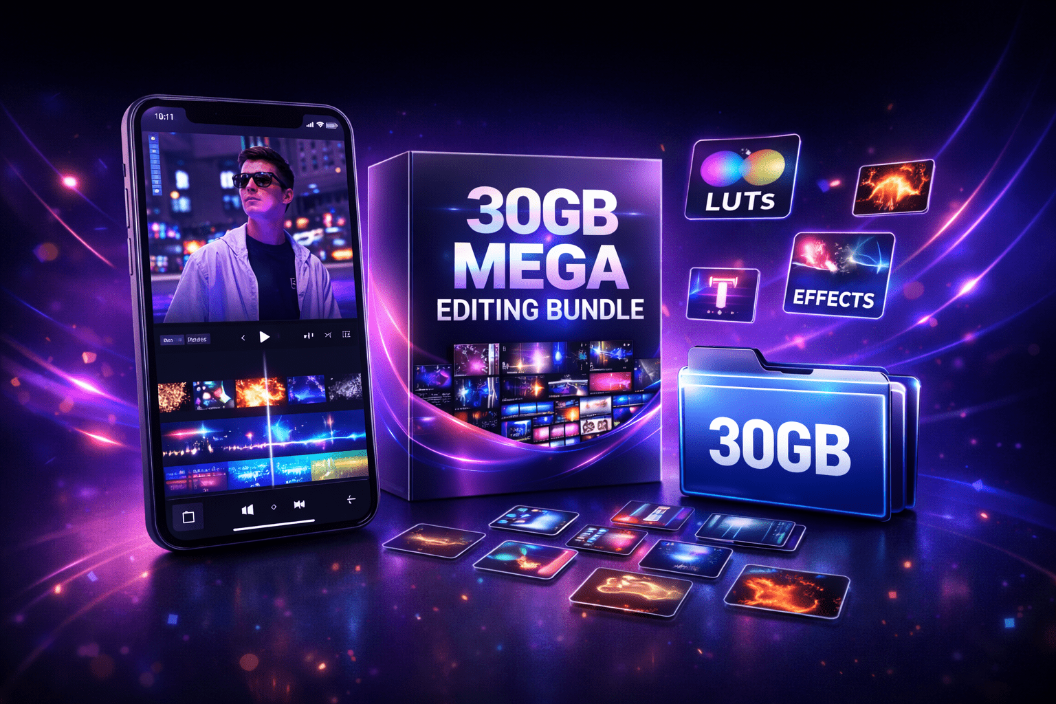 This bundle includes 5000+ premium editing assets, such as PNG overlays, LUTs & presets, fonts, transitions, effects, and more to make your videos look professional.